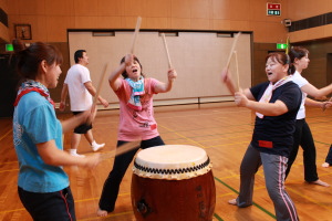 締太鼓のリズムは難しい それでも必死に叩きます。 大太鼓はそれでも簡単そう。 笑顔が出てきました。 |
